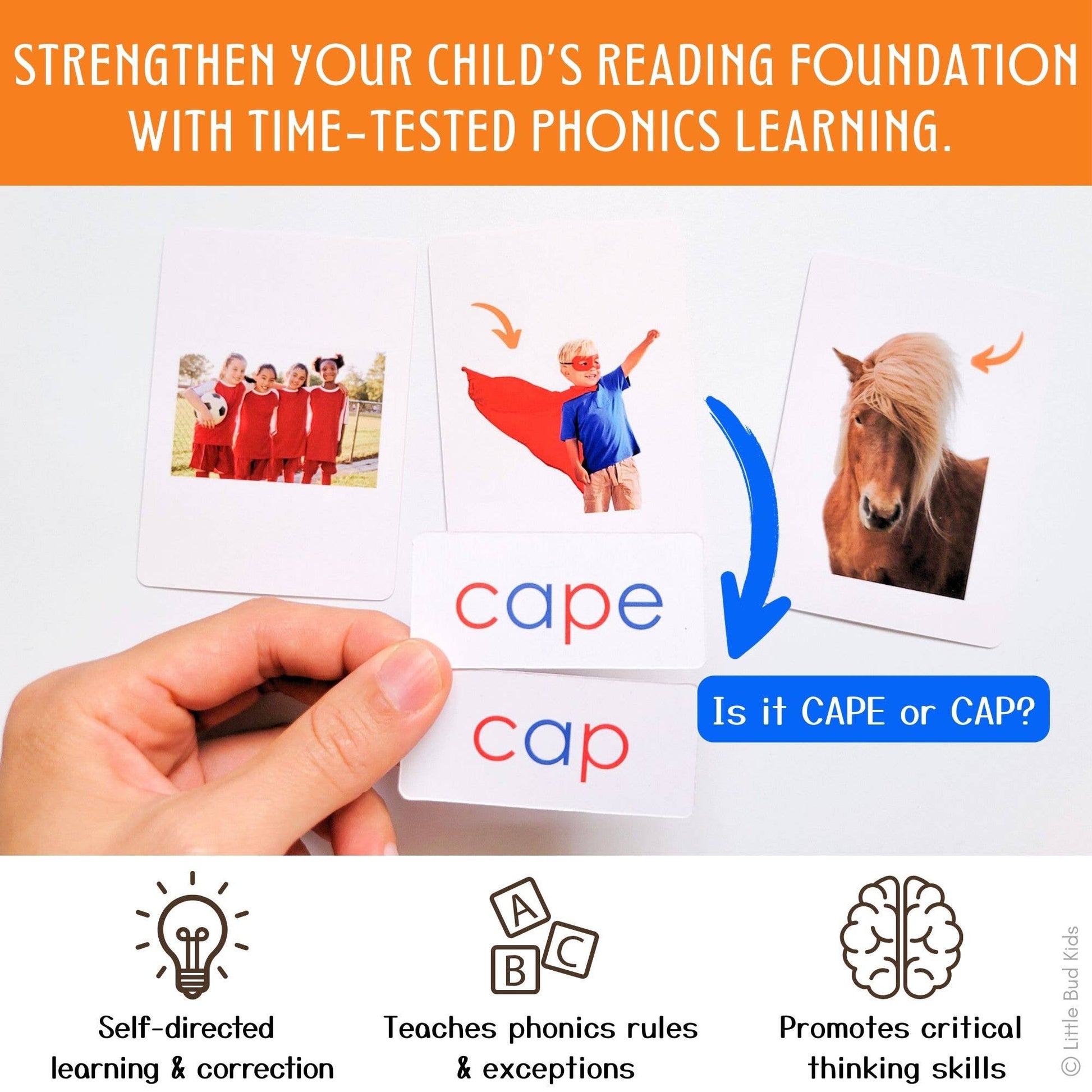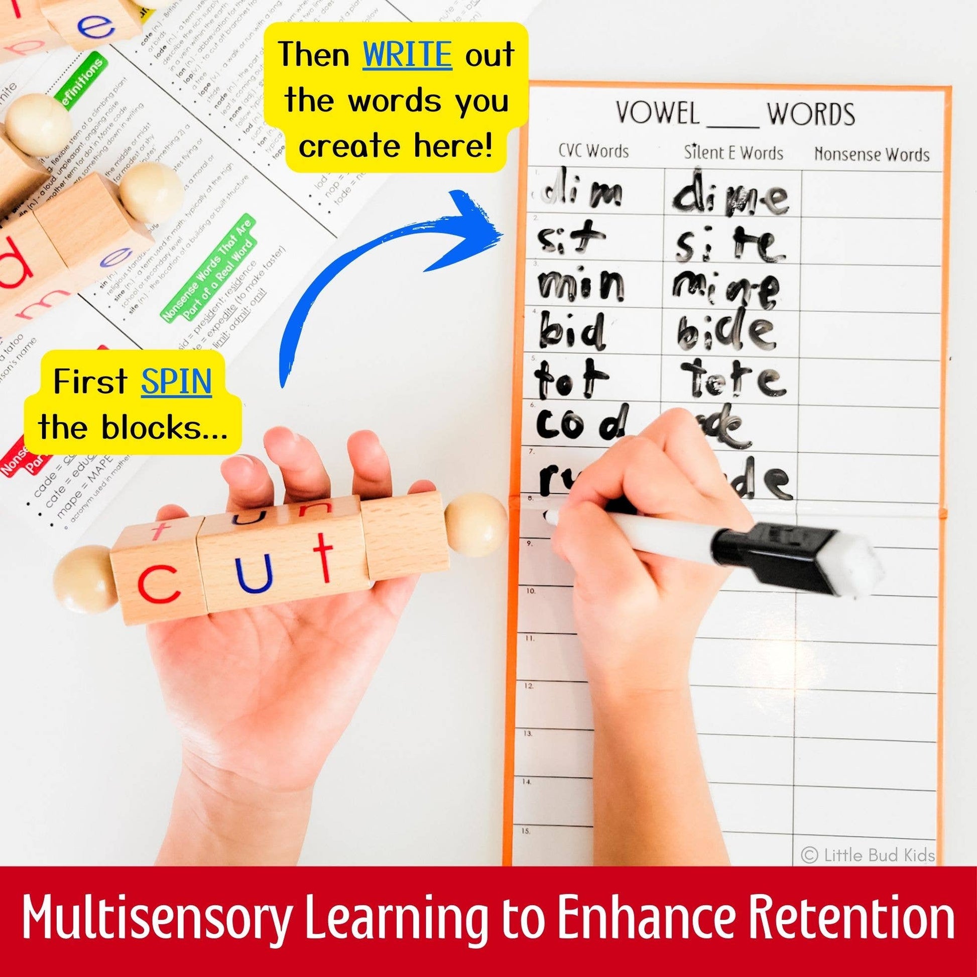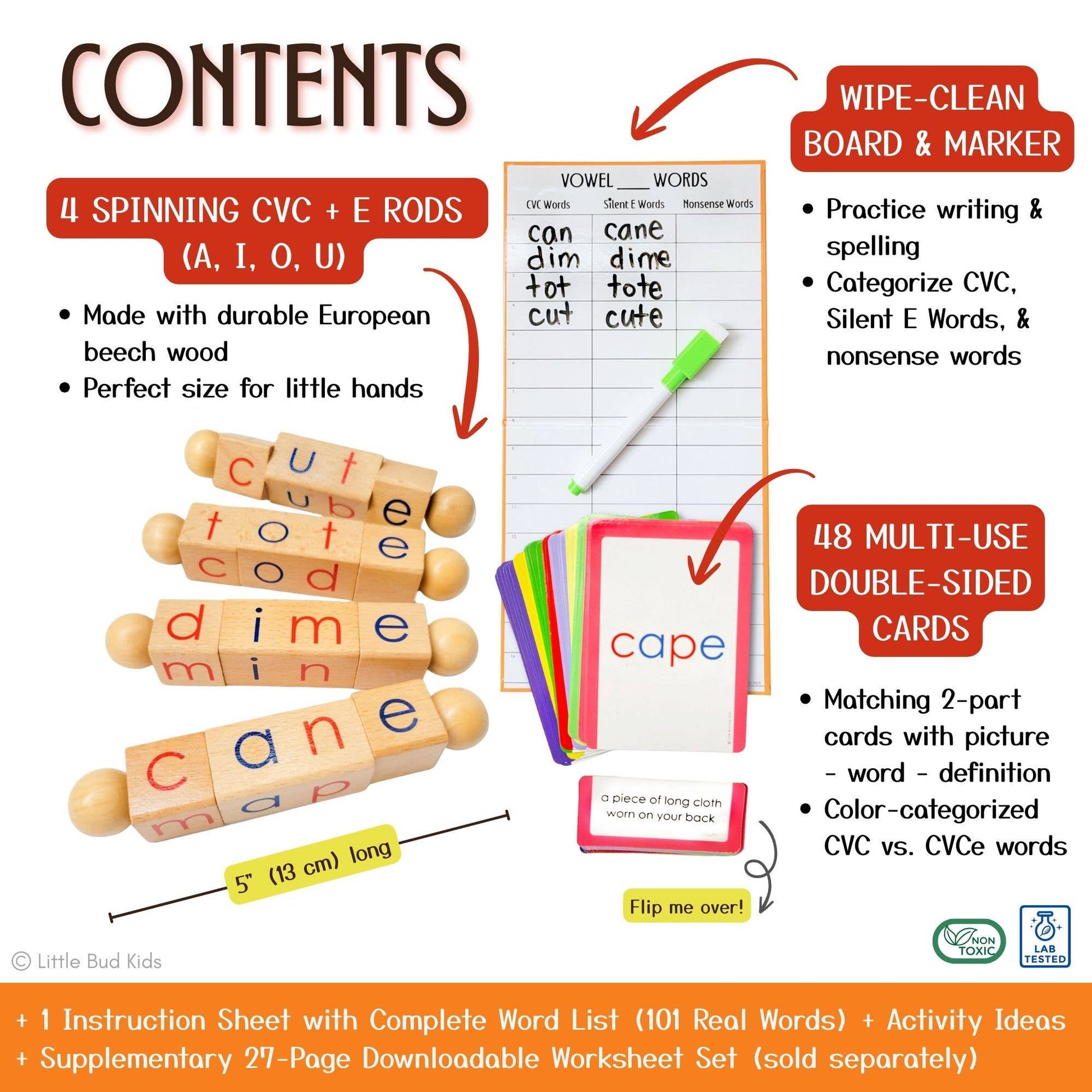 This is a perfect companion to our foundational reading phonics set, the Spin-and-Read Blocks.** Transform "C-A-P" into "C-A-P-E" and learn the magical steps how this is done with a magical letter, the silent E!