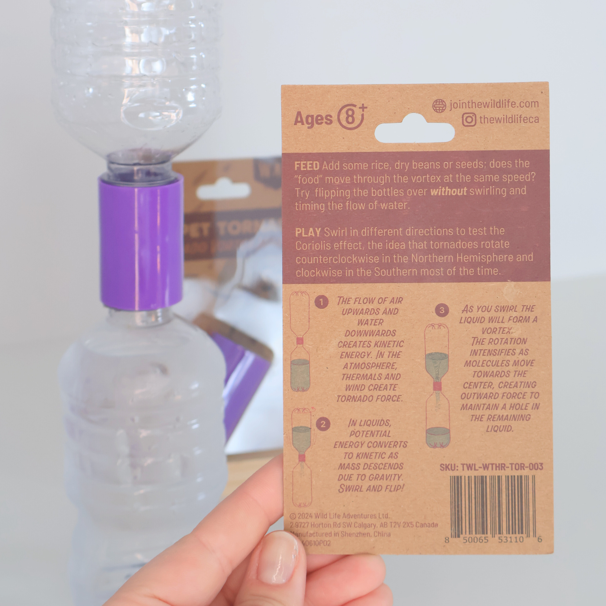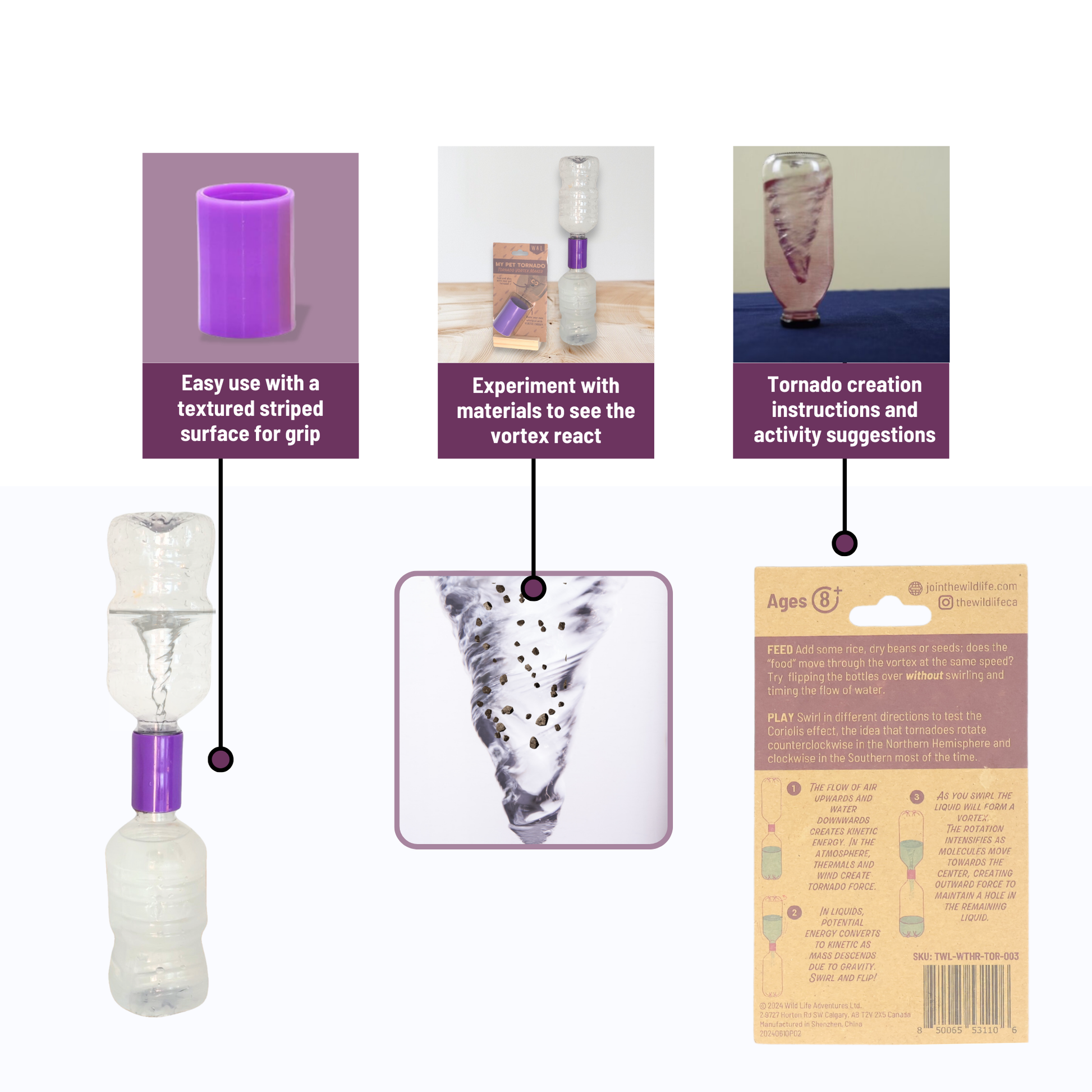 This tornado tube kit allows you to connect two bottles and create a mesmerizing vortex of water and air.