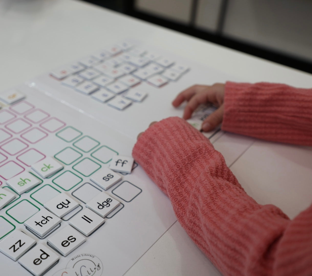 Each kit comes with a thin magnetic whiteboard folder and a pack of 80 magnetic foam tiles (79 graphemes and 1 blank tile)