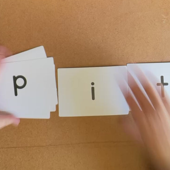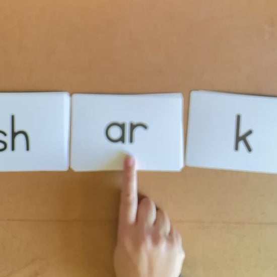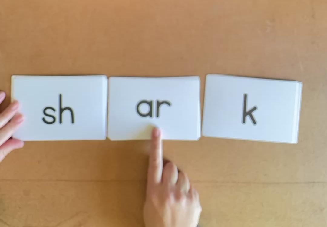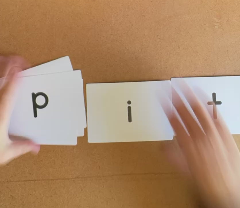 Students say the sounds while the teacher slides her hand under the cards together to form a word (real or nonsensical)